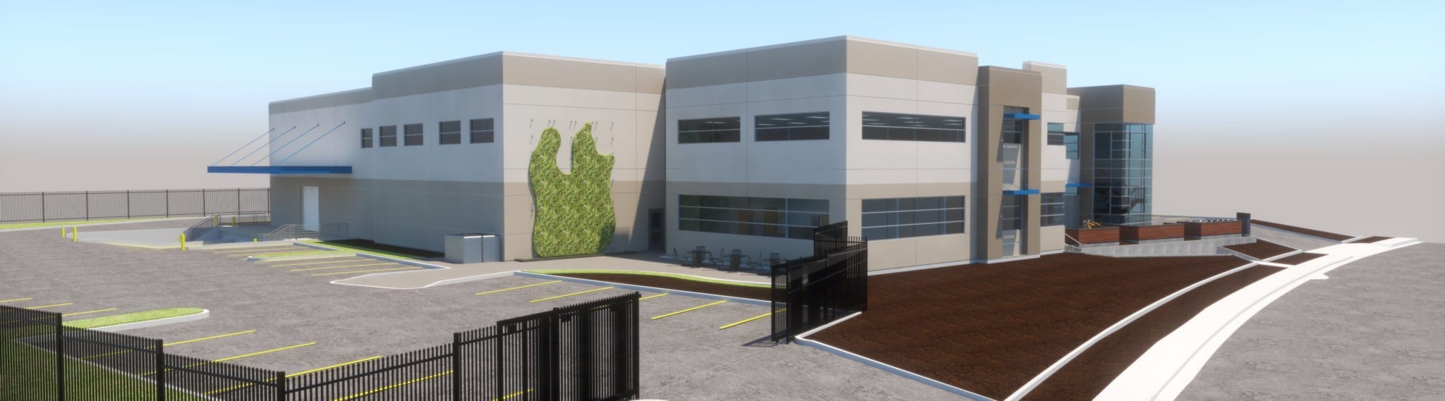 The proposed building consists of tilt-up concrete panels with smooth painted finish, horizontal panel reveals, and other architectural elements. The building will also feature a main truck dock and a small number of specialized vehicle docks for AutoChlor’s daily maintenance operations.