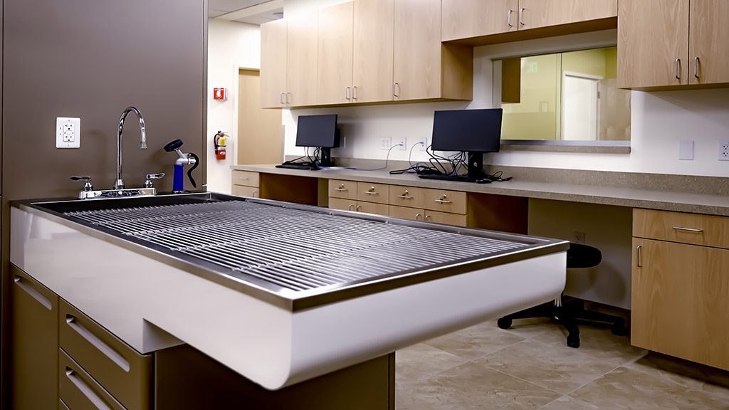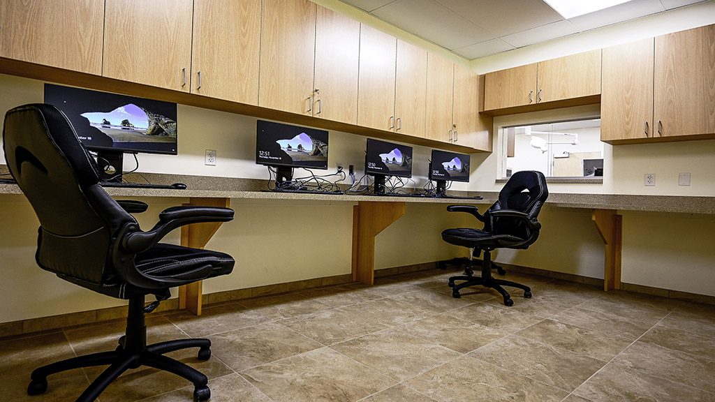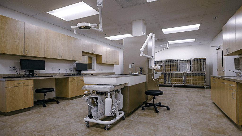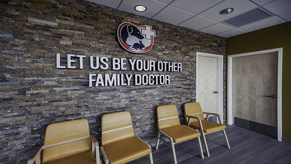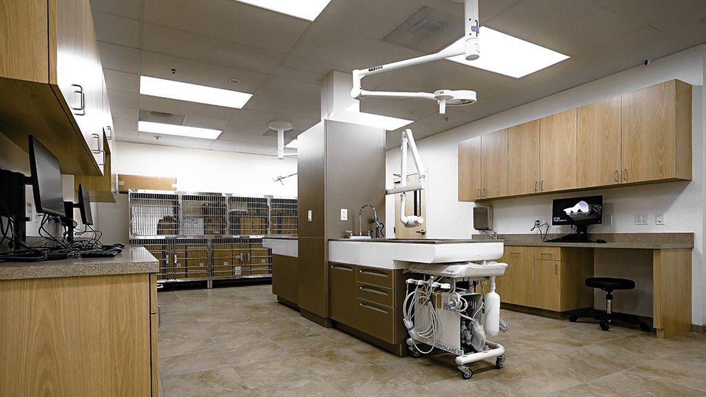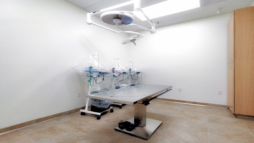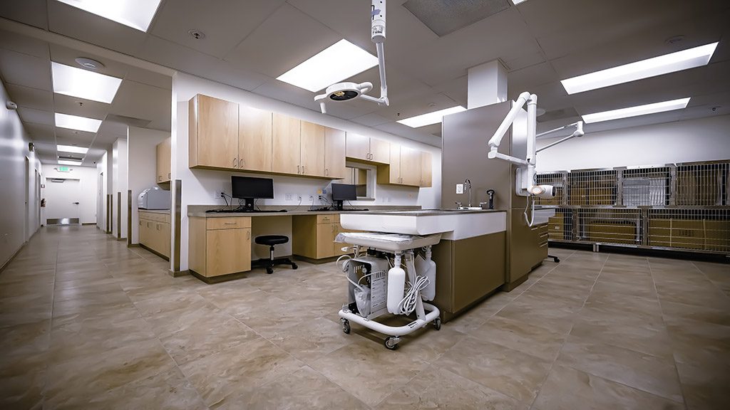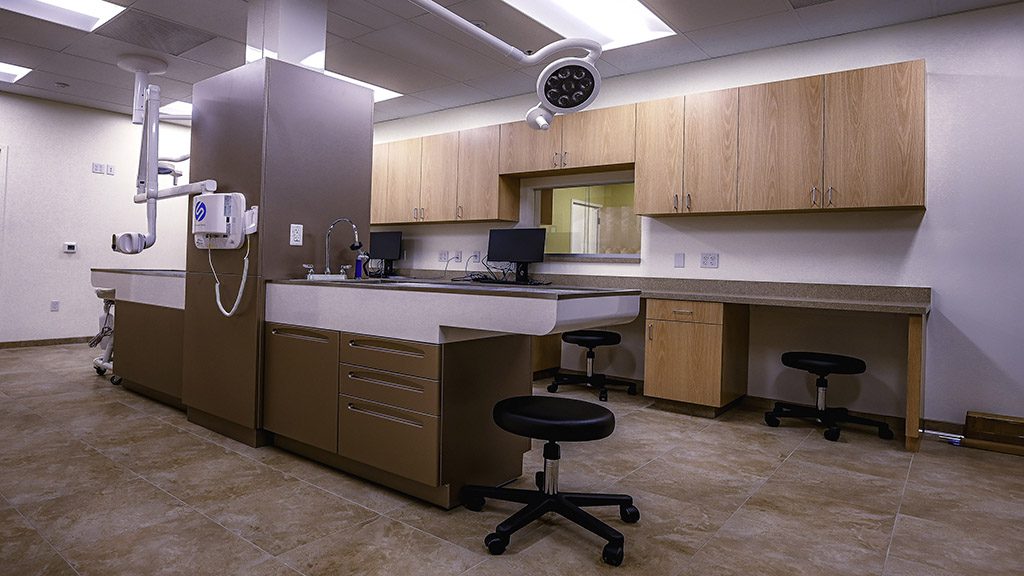 As you make your way into the new clinic’s entrance, you can observe its welcoming motto on a multi-toned stone wall accented by pendant lighting highlighting the space’s unique charm. To accommodate the clinic’s needs, surgery and treatment rooms were fitted with specialty lighting and plumbing, while the x-ray room was fitted with lead-lined sheetrock.