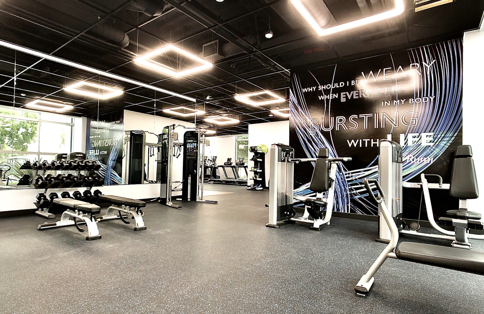 With an open structure painted gypsum ceiling, modern accent lights, a water fountain, and new locker/shower restrooms, this fitness center offers its office tenants a convenient and inviting workout option.